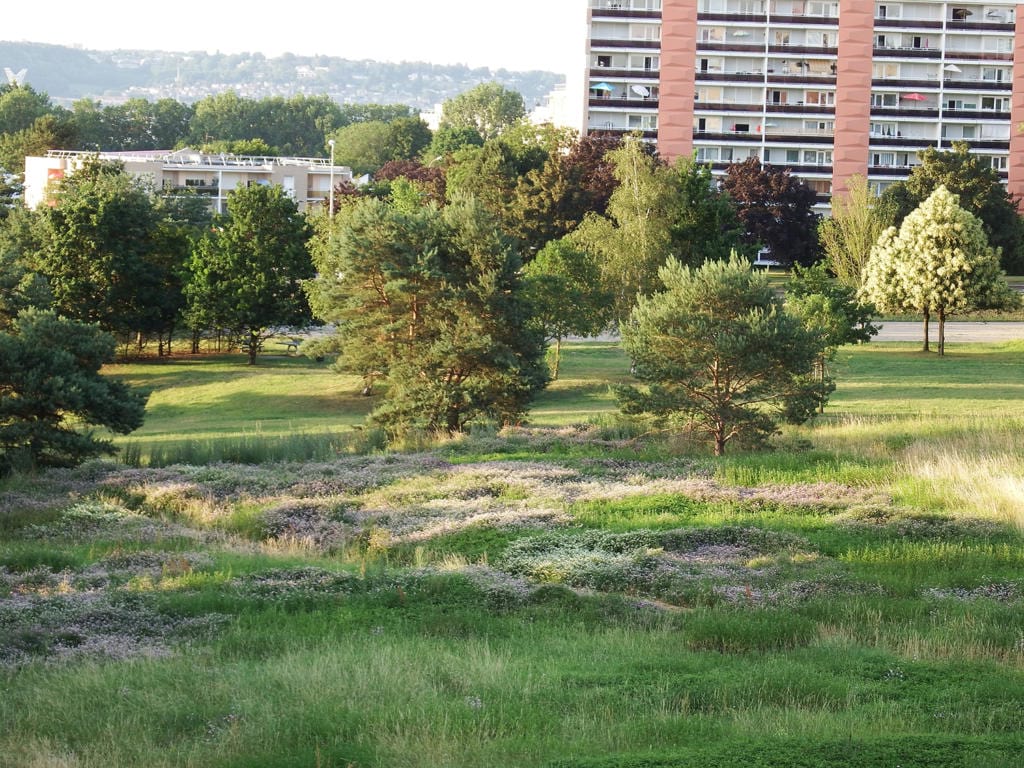 Cette partie de la ville, située sur d’anciennes prairies, correspond à la zone développée à partir des années 50, sous l’impulsion d’une stratégie d’urbanisation planifiée. La commune équipe ses nouvelles zones d’équipements publics et de cases commerciales. Se dessine alors une ville verte, peu répandue pour l’époque, avec l’idée de créer une union entre modernité et nature, dans le but de préserver et d’offrir une qualité de vie en zone urbaine.